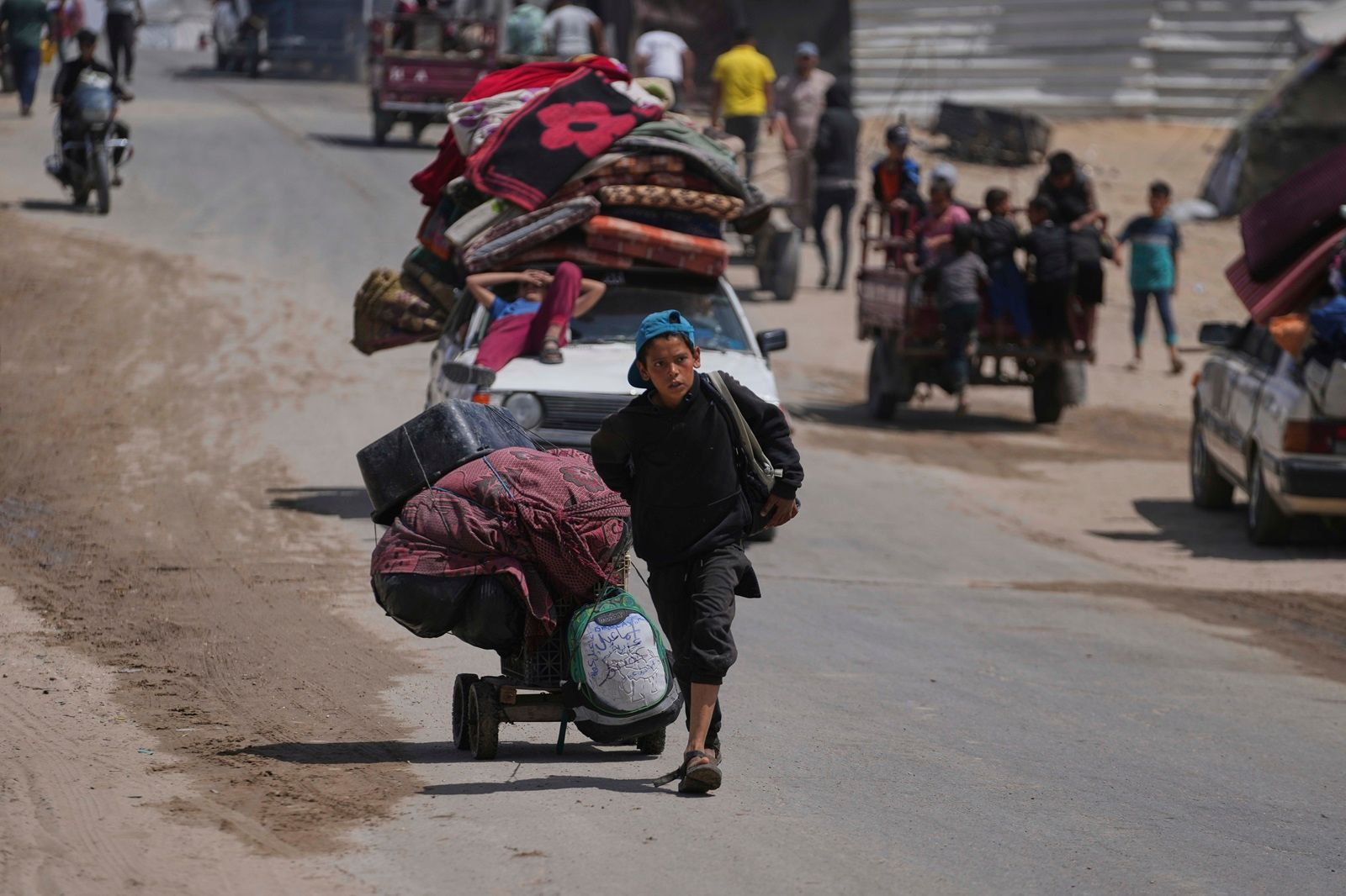 Με τα πόδια, με ποδήλατα, με κάρα που έσερναν γαϊδούρια, άνδρες, γυναίκες και παιδιά έφευγαν από τη Χαν Γιούνις κουβαλώντας κάποια από τα υπάρχοντά τους, δοχεία με νερό, κουβέρτες και διάφορα σκεύη.