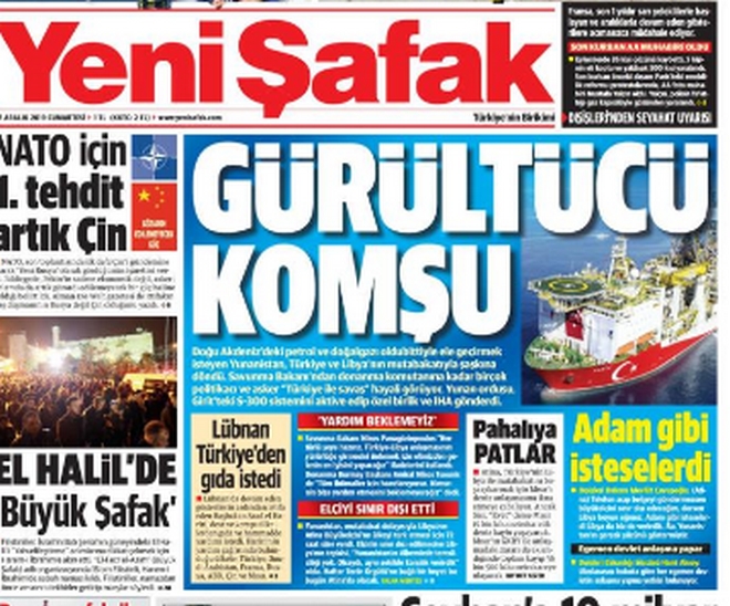 Τύμπανα πολέμου “ακούει” από την πλευρά της Ελλάδας η τουρκική εφημερίδα Γενί Σαφάκ, η οποία στο πρωτοσέλιδό της με τίτλο “Θορυβώδης γείτονας” γράφει ότι πολλοί Έλληνες πολιτικοί και στρατιωτικοί «ονειρεύονται πόλεμο με την Τουρκία».