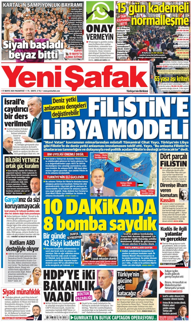 Όπως αναφέρεται, “η υπογραφή συμφωνίας ΑΟΖ Τουρκιάς-Λιβύης μπορεί να αλλάξει ισορροπίες” ενώ ο απόστρατος ναύαρχος Γιαϊτζί προτείνει άμεση υπογραφή συμφωνίας με την Παλαιστίνη. Την ίδια ώρα ο τούρκος υπουργός Εξωτερικών Μαβλούτ Τσαβούσογλου κάνει λόγο για εθνοκάθαρση απο πλευράς του Ισραήλ και δηλώνει πως η Τουρκία θέλει να ηγηθεί στον Ισλαμικό κόσμο.