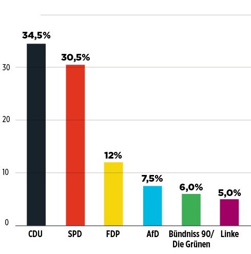 Η Χριστιανοδημοκρατική Ένωση (CDU) συγκέντρωσε περίπου το 34,5% των ψήφων, εξασφαλίζοντας προβάδισμα 4 ποσοστιαίων μονάδων σε σύγκριση με το SPD που καταγράφει τα χειρότερα αποτελέσματα στην ιστορία του σε αυτό το κρατίδιο, σύμφωνα με τις εκτιμήσεις που μετέδωσαν τα κρατικά τηλεοπτικά δίκτυα ARD και ZDF γύρω στις 19.30 ώρα Ελλάδας.