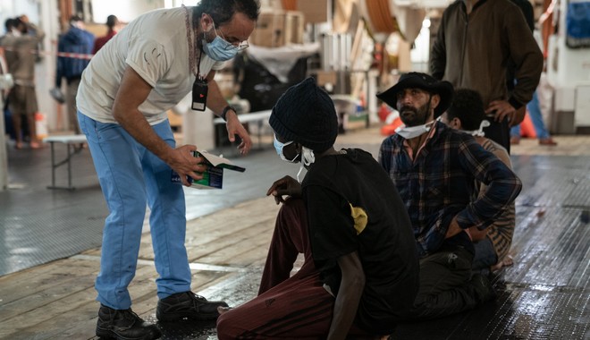 Μετά από μέρες αναμονής πάνω στο πλοίο των Γιατρών Χωρίς Σύνορα για νέα, ανακοινώνεται τελικά ότι το ασφαλές λιμάνι αποβίβασης θα είναι το Taranto της Ιταλίας. Η συντριπτική πλειοψηφία γιορτάζει με αγκαλιές και χορό, αλλά μερικοί παραμένουν σιωπηλοί.