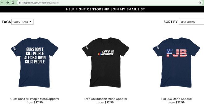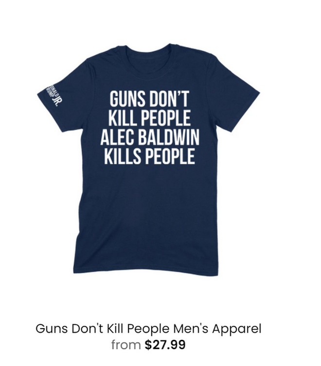 Ο Ντόναλντ Τραμπ Jr βρήκε το τραγικό συμβάν του θανάτου της Χαλίνα Χάτσινς, αφορμή να κυκλοφορήσει νέα σειρά με χλευαστικά μπλουζάκια κατά του Άλεκ Μπάλντουιν. “Τα όπλα δεν σκοτώνουν ανθρώπους, ο Άλεκ Μπάλντουιν σκοτώνει”, γράφει στην μπροστινή όψη του το T-Shirt, που πωλείται έναντι της τιμής των 27,99 δολαρίων.