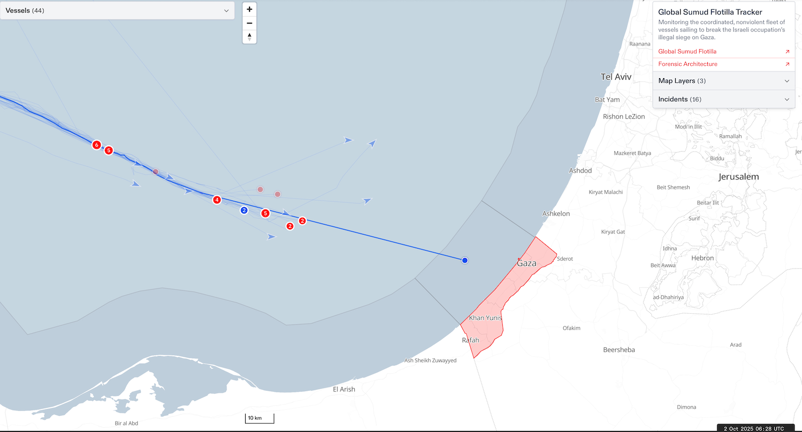 Τουλάχιστον 39 πλοία του στολίσκου Global Sumud Flotilla φαίνεται πως έχουν αναχαιτιστεί από τις ισραηλινές δυνάμεις και κατευθύνονται στο λιμάνι του Άσντοντ, μαζί με τα πληρώματά που κρατούνται από το Ισραήλ, προκειμένου να απελαθούν.