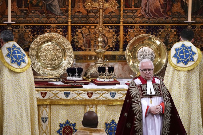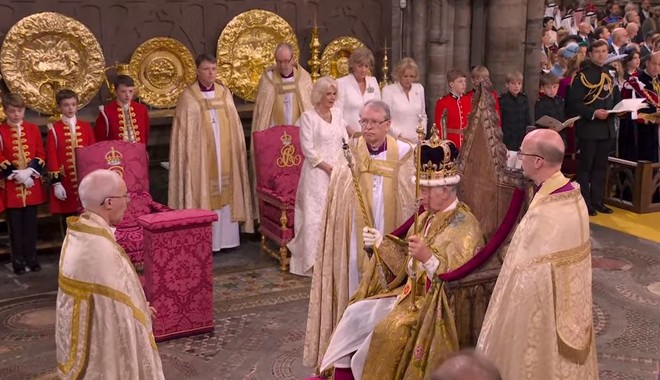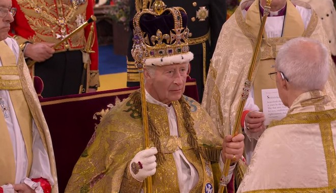 Ο Αρχιεπίσκοπος του Καντέρμπουρι έστεψε τον βασιλιά Κάρολο σε μια τελετή σήμερα στο Λονδίνο, τοποθετώντας το ηλικίας 360 ετών Στέμμα του Αγίου Εδουάρδου στο κεφάλι του μονάρχη καθώς εκείνος καθόταν σε έναν θρόνο του 14ου αιώνα στο Αβαείο του Γουεστμίνστερ, με το “God Save The King” να δονεί το Αββαείο.