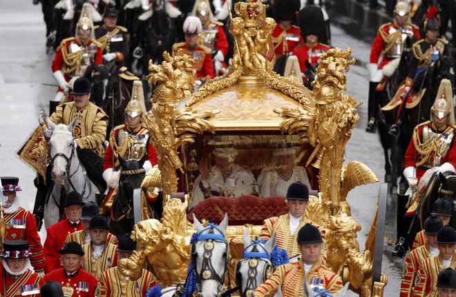 Ο Κάρολος και η Καμίλα έφτασαν με την “Diamond Jubilee State Coach”, την κλειστή άμαξα που σέρνουν έξι άλογα. Εκατοντάδες στρατιώτες λαμβάνουν μέρος σε αυτή την πομπή από το Μολ, τη μακρά λεωφόρο που ξεκινά από το Μπάκιγχαμ και φθάνει μέχρι την Τραφάλγκαρ Σκουέαρ.