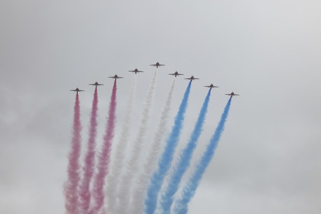 Λίγα λεπτά αργότερα, ο βασιλιάς Κάρολος Γ’ έχοντας στο πλευρό του τη βασίλισσα Καμίλα και μέλη της βασιλικής οικογένειας βγήκαν στο μπαλκόνι και αφού χαιρέτισαν το συγκεντρωμένο πλήθος, παρακολούθησαν μια εντυπωσιακή εξάλεπτη πτήση επίδειξης.