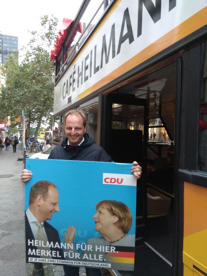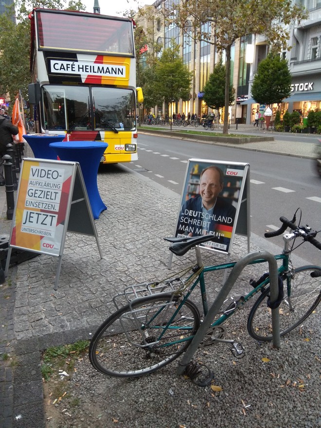 Στο Steglitz ο Thomas Heilmann, υποψήφιος με την CDU για το Bundestag και ένα από τα στελέχη που θεωρείται καθαρά του κλίματος Μέρκελ (εξ ου και μία από τις αφίσες του τον παρουσιάζει δίπλα στην καγκελάριο, να κοιτάζονται στα μάτια), στέκεται έξω από ένα διώροφο λεωφορείο το οποίο έχει βαφτίσει “Cafe Heilmann” και συνεχίζει τη μάχη προς άγραν της απευθείας ψήφου (οι Γερμανοί έχουν δύο ψήφους, με την πρώτη επιλέγουν βουλευτή και με τη δεύτερη κόμμα), ενώ σε ένα διακριτικό τραπεζάκι τρεις κοπέλες μαζεύουν υπογραφές και προσφέρουν σε όποιον περαστικό ενδιαφερθεί ενημερωτικό υλικό.