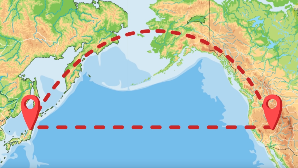Όπως μας εξηγεί το βίντεο, σε έναν δισδιάστατο χάρτη, το “ουράνιο τόξο” πορείας για να αποφύγει κανείς τον Ειρηνικό μπορεί να μοιάζει μεγαλύτερη διαδρομή, αλλά δεν είναι.