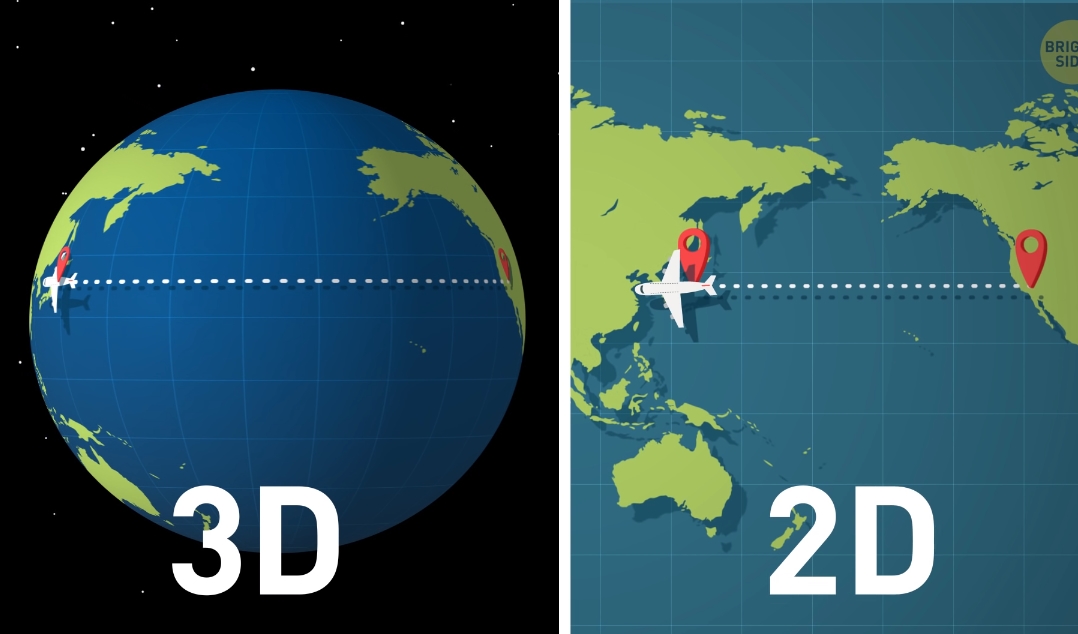 Αυτό γιατί η Γη δεν είναι μια τέλεια σφαίρα, και έτσι, μια ευθεία γραμμή θα ήταν εντελώς διαφορετική σε τρισδιάστατη απεικόνιση. Ο συνδυασμός των παραπάνω παραγόντων, δηλαδή η καμπυλότητα της Γης και το επιπλέον εξισωτικό πλάτος της, σημαίνει ότι η καμπύλη προς τους πόλους είναι μικρότερη, σε σχέση με την “ευθεία” γραμμή, ακριβώς πάνω από τον Ειρηνικό.