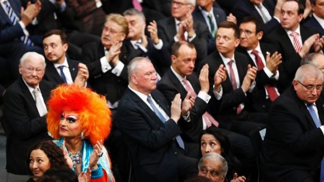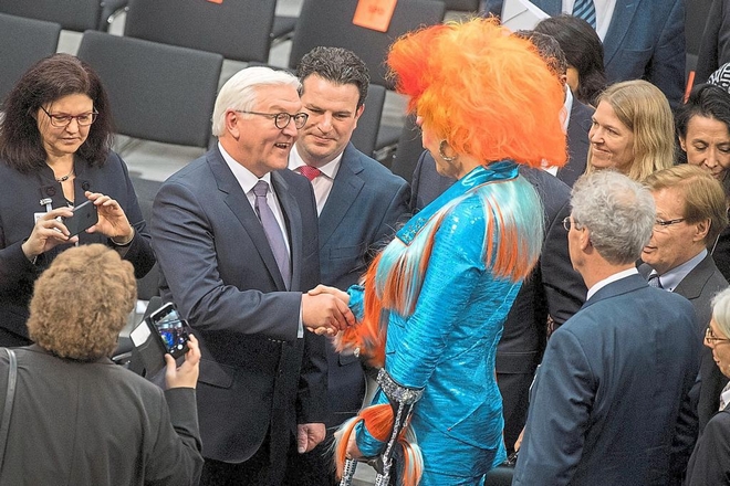 Μια διαφορετική παρουσία έκλεψε τις εντυπώσεις την Κυριακή, κατά την εκλογή του Φρανκ Βάλτερ Σταϊνμάιερ στην προεδρία της Γερμανίας, καθώς με ύψος άνω των 2μ00, με πορτοκαλί μαλλί, έντονο βάψιμο και εξίσου εντυπωσιακά ρούχα, ήταν αδύνατο να μην την δει κανείς, αφού ξεχώριζε “σαν τη μύγα μεσ’ το γάλα”.