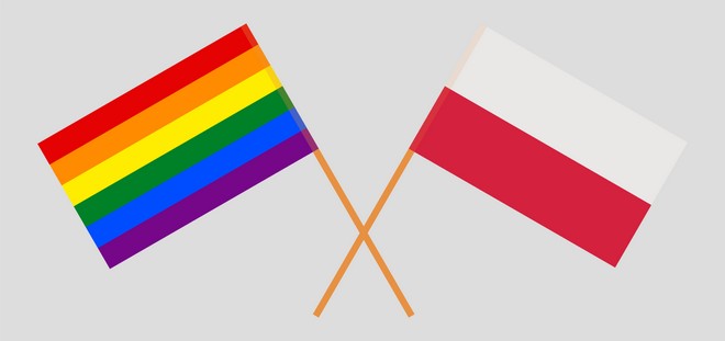 Η σημαία της ΛΟΑΤΚΙ Υπερηφάνειας μαζί με τη σημαία της Πολωνίας shutterstock