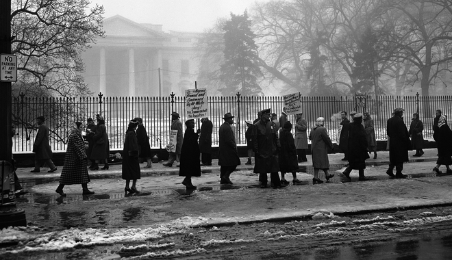 Σε αυτή τη φωτογραφία από τις 30 Ιανουαρίου του 1951, διαδηλωτές βρίσκονται έξω από τον Λευκό Οίκο στην Ουάσινγκτον, με σκοπό να πείσουν τον τότε Πρόεδρο, Harry Truman, να απαγορεύσει την εκτέλεση των επτά ανδρών.