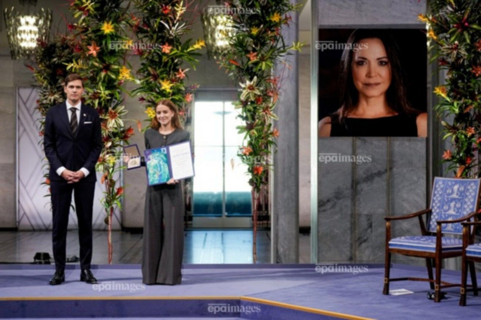 Η κόρη της Μαρία Κορίνα Μάτσαδο, ηγέτιδας της αντιπολίτευσης στη Βενεζουέλα, παρέλαβε το Βραβείο Ειρήνης Νόμπελ εκ μέρους της μητέρας της, η οποία δεν μπόρεσε να παραβρεθεί στην τελετή.