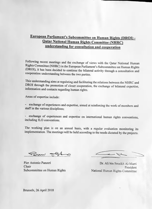 Εγγραφο με το οποίο πιστοποιείται η συνεργασία (ημιεπίσημου χαρακτήρα) μεταξύ της Ευρωπαϊκής Ενωσης και του Κατάρ στην οποία πρωταγωνίστησε ο κατηγορούμενος σήμερα Πιερ Αντόνιο Παντσέρι έφερε στο φως της δημοσιότητας το Politico.