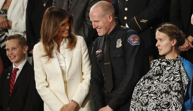 Τα χαμόγελα της πρώτης κυρίας των ΗΠΑ μπορούσαν να μετρηθούν στα δάκτυλα του ενός χεριού χθες. Το πρώτο, το πιο εντυπωσιακό, μόλις εμφανίστηκε στη Βουλή των Αντιπροσώπων όταν τη χειροκρότησαν όλοι οι παρευρισκόμενοι. Στη συνέχεια συνομίλησε χαλαρά με τον 12χρονο γιο της Μπάρον που καθόταν δεξιά της και τον σερίφη της Αλμπουκέρκης Τζο Αρπάγιο στα αριστερά της.