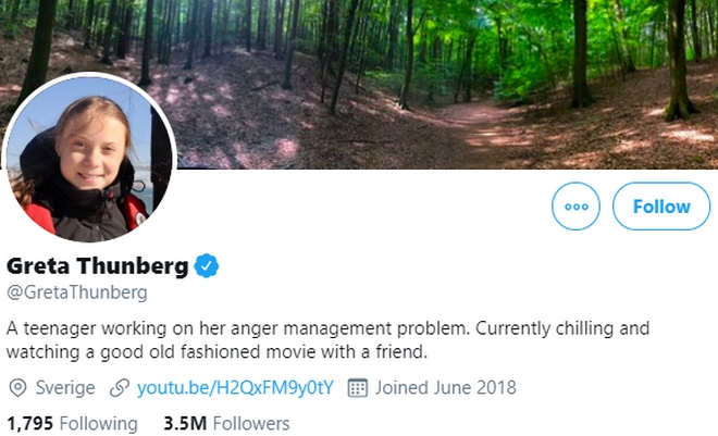 Η Γκρέτα δεν θα μπορούσε φυσικά να αφήσει την “πρόκληση” του Τραμπ αναπάντητη. Έτσι άλλαξε το “Bio” του προφίλ της στο Twitter γράφοντας : “Μια θυμωμένη έφηβη, που προσπαθεί να διαχειριστεί τον θυμό της. Αυτή τη στιγμή χαλαρώνει παρακολουθώντας μια καλή παλιά ταινία με έναν φίλο”.