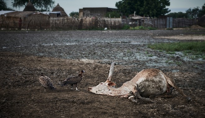 Ένα νεκρό ζώο και δίπλα του γύπες στην πόλη Abyei. Οι πλημμύρες έχουν προκαλέσει σημαντική έλλειψη τροφίμων τόσο για τους ανθρώπους όσο και για τα ζώα. Christina Simons