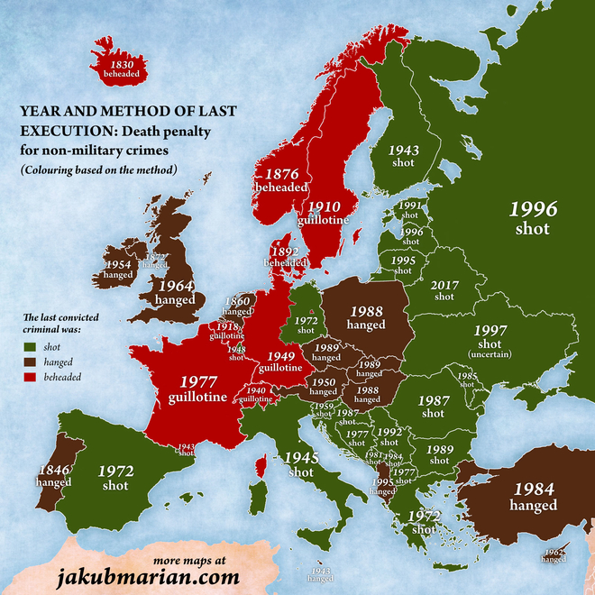 Χρωματική απεικόνιση των εκτελέσεων θανατικών ποινών στην Ευρώπη με βάση τον τρόπο εκτέλεσης jakubmarian
