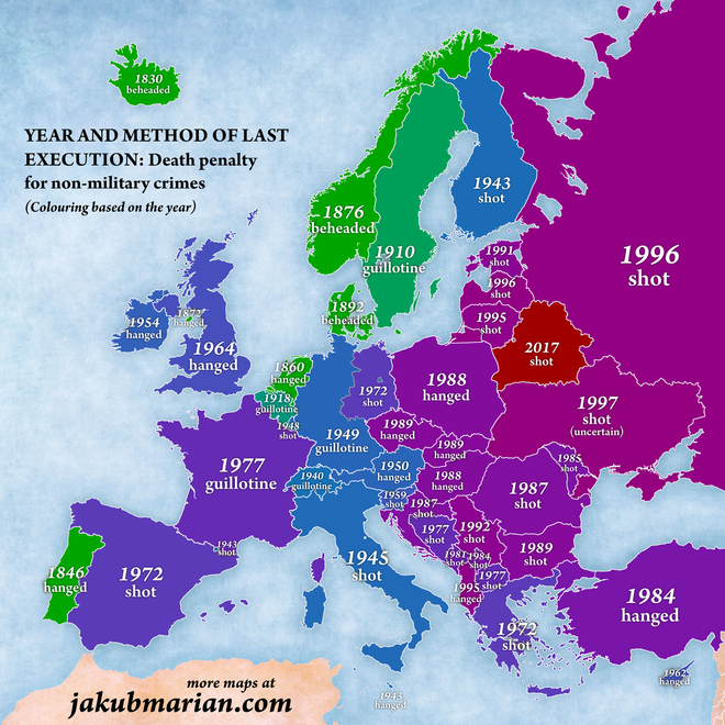 Χρωματική απεικόνιση των εκτελέσεων θανατικών ποινών στην Ευρώπη με βάση την χρονολογία της τελευταίας εκτέλεσης JakubMarian