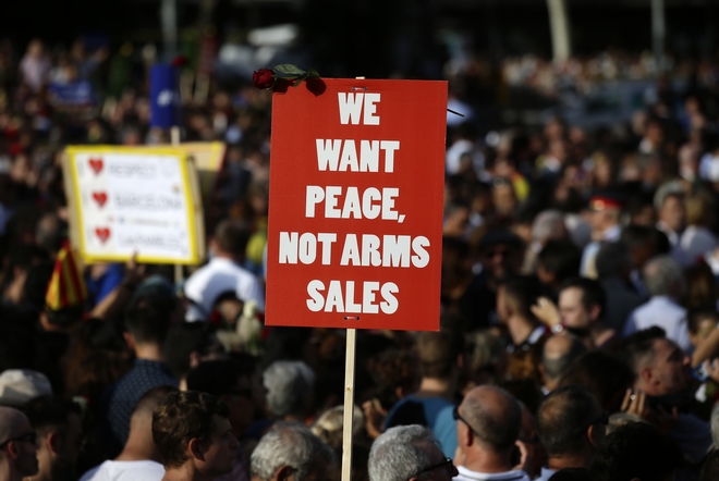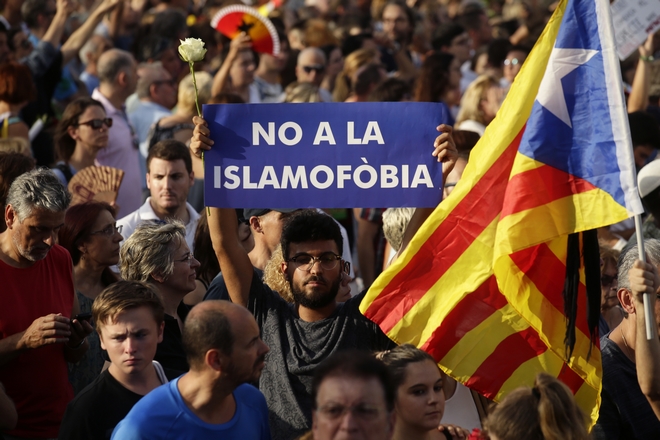 “Η καλύτερη απάντηση: η ειρήνη” και “Όχι στην ισλαμοφοβία” έγραφαν τα πλακάτ που κρατούσαν πολλοί συγκεντρωμένοι. Άλλοι διαδηλωτές είχαν υψώσει καταλανικές σημαίες.
