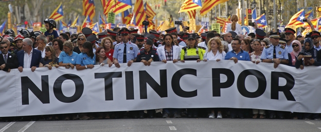 Στην κορυφή της πορείας βρισκόταν το μεγάλο πανό με το σύνθημα “No tinc por”, δηλαδή “Δεν φοβάμαι”, στα καταλανικά. Στην πρώτη θέση, ακριβώς πίσω από το πανό, όπως επιθυμούσαν οι δημοτικές αρχές, οι εκπρόσωποι των υπηρεσιών και των συλλογικοτήτων που από την πρώτη στιγμή έδωσαν τον καλύτερο εαυτό τους για να βοηθήσουν τα θύματα: ένστολοι αστυνομικοί και πυροσβέστες, γιατροί με λευκές ρόμπες, οδηγοί ταξί, καταστηματάρχες, ακόμη και κάτοικοι της λεωφόρου Ράμπλα.