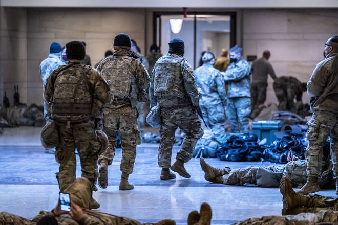 Αν και οι στρατιώτες της Εθνοφρουράς έχουν αναπτυχθεί εντός και εκτός του Κογκρέσου από τουλάχιστον την περασμένη Παρασκευή, πιο πριν δεν ήταν οπλισμένοι με τουφέκια. Τώρα, ορισμένοι από τους 20.000 στρατιώτες της Εθνοφρουράς, που διατάχθηκαν να πάνε στην Ουάσιγκτον για να προστατεύσουν την πόλη πριν από την ορκωμοσία του εκλεγμένου προέδρου Τζο Μπάιντεν, στις 20 Ιανουαρίου, κυκλοφορούν με το όπλο στο χέρι. Ασπίδες και μάσκες αερίου στοιβάζονται στους διαδρόμους.