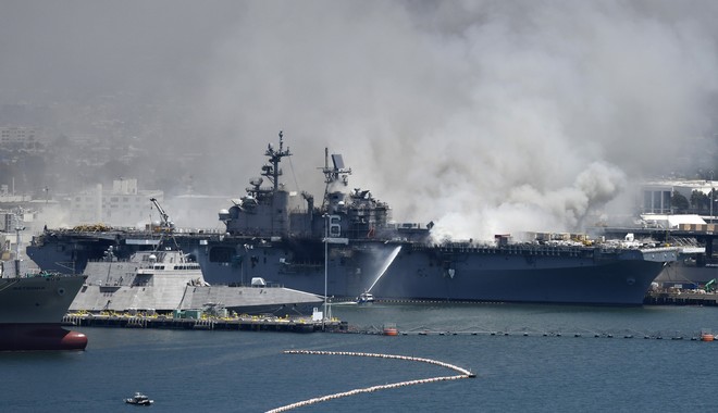 Αμερικανικά τηλεοπτικά δίκτυα μετέδωσαν πλάνα στα οποία εικονίζεται πυκνός γκρίζος καπνός να υψώνεται από το USS Bonhomme Richard, δεμένο στην αποβάθρα της βάσης του στο Σαν Ντιέγκο για συντήρηση. Γύρω από το πλοίο, μήκους 257 μέτρων, πυροσβεστικά σκάφη χρησιμοποιούσαν αντλίες νερού.