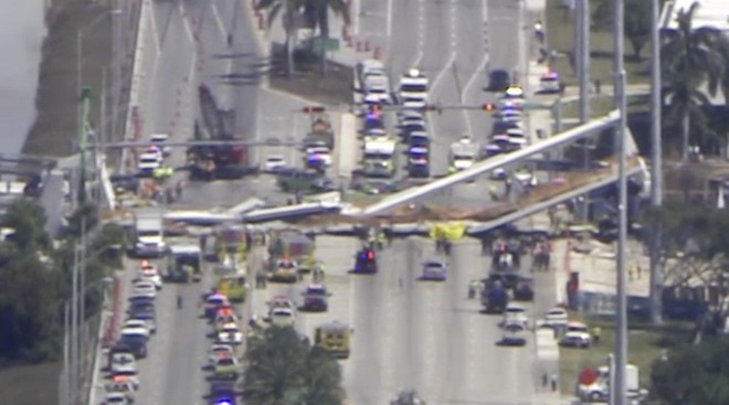 Emergency personnel respond to people near a collapsed pedestrian bridge at Florida International University on Thursday, March 15, 2018, in the Miami area. The brand-new pedestrian bridge collapsed onto a highway crushing multiple vehicles and killing several people. (WTVJ NBC6 via AP) AP