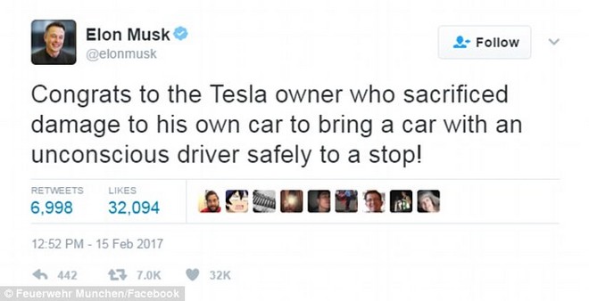 Ο επικεφαλής της Tesla -της μάρκας του αυτοκινήτου που οδηγούσε ο άνδρας- ανακοίνωσε πως το αυτοκίνητο θα επισκευαστεί δωρεάν επιβραβεύοντας την πράξη του οδηγού