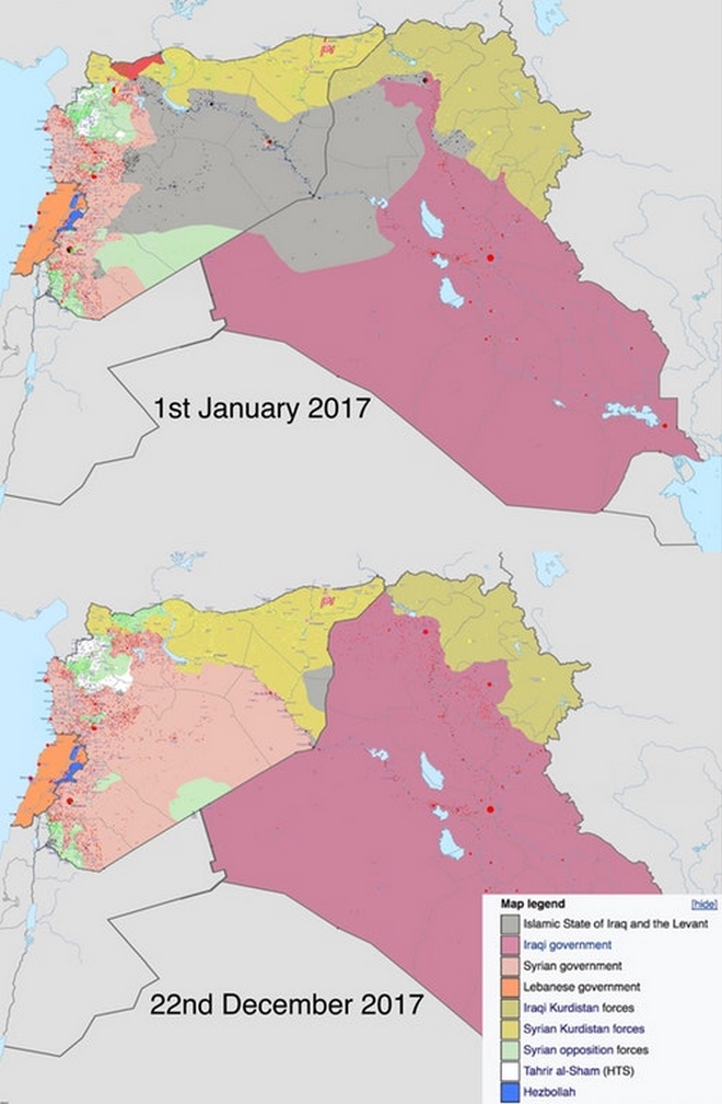 ISIS: Με γκρι χρώμα τα εδάφη που κατείχε 1/1/2017. Τι κατέχει ένα χρόνο μετά