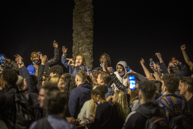 Μερικοί φορούσαν μάσκες, όμως οι κοινωνικές αποστάσεις δεν τηρούνταν, καθώς φίλοι φιλιούνταν, αγκαλιάζονταν, χόρευαν και τραγουδούσαν.