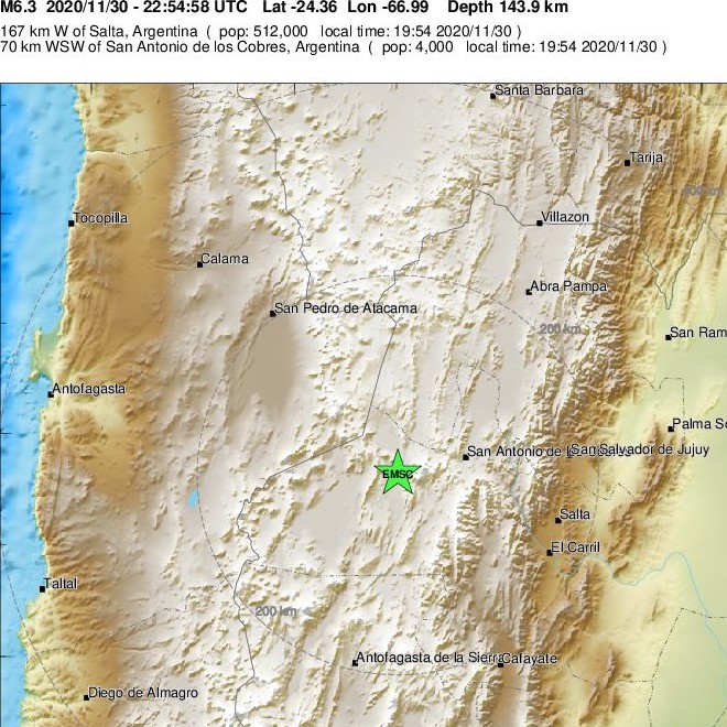 Σύμφωνα με το Ευρωπαϊκό Μεσογειακό Σεισμολογικό Κέντρο (EMSC) ο σεισμνεςσός σημειώθηκε 167 χιλιόμετρα δυτικά από την πόλη Σάλτα και είχε εστιακό βάθος 144 χιλιόμετρα.
