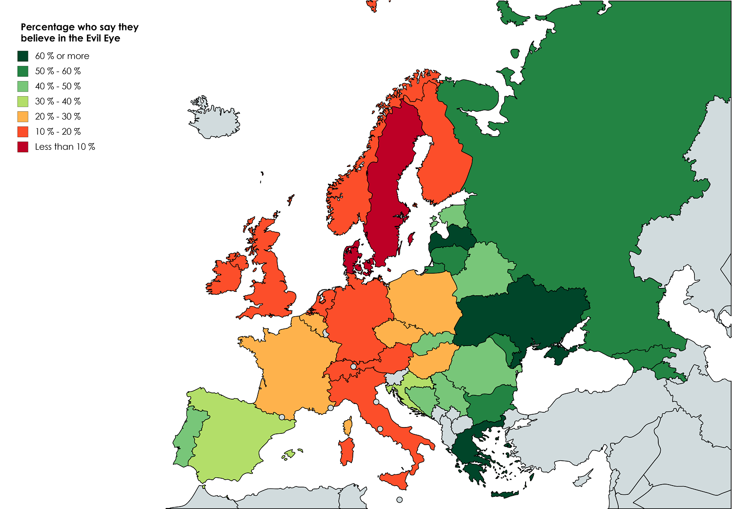 Στον αντίποδα βρίσκονται λαοί της Δυτικής Ευρώπης με χαμηλά διψήφια ποσοστά ενώ στην Σκανδιναβία συναντάμε και μονοψήφια ποσοστά. Συγκεκριμένα σε Σουηδία και Δανία το ποσοστό των ανθρώπων που πιστεύουν στο “κακό μάτι” είναι 9%.
