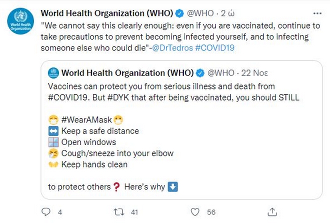 «Σε πολλές χώρες και κοινότητες, ανησυχούμε για την ψευδή αίσθηση ασφάλειας, ότι τα εμβόλια τελείωσαν την πανδημία και ότι οι άνθρωποι που έχουν εμβολιαστεί δεν χρειάζεται να λαμβάνουν άλλες προφυλάξεις», πρόσθεσε.