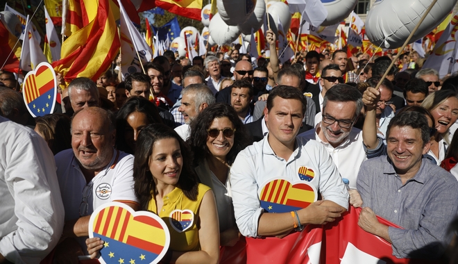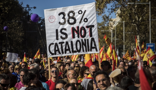 Εκατοντάδες χιλιάδες Καταλανοί οπαδοί της ενότητας της Ισπανίας διαδηλώνουν σήμερα στους δρόμους της Βαρκελόνης, δύο ημέρες μετά την κήρυξη της ανεξαρτησίας από το καταλανικό κοινοβούλιο