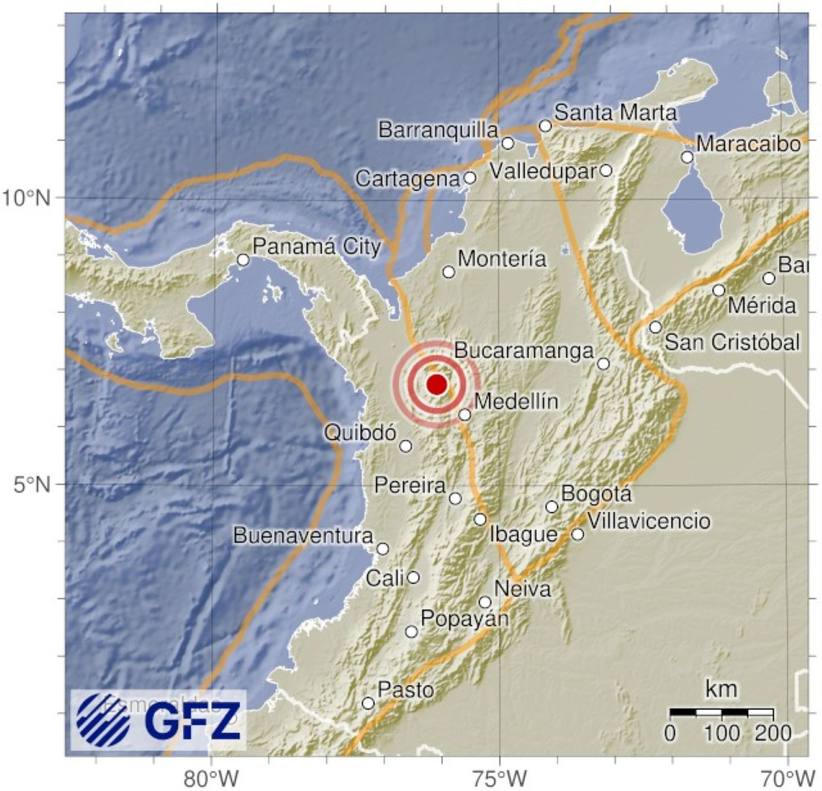 Σεισμός 5,7 βαθμών Ρίχτερ έπληξε σήμερα τη βόρεια Κολομβία. Είχε εστιακό βάθος 10 χιλιομέτρων.