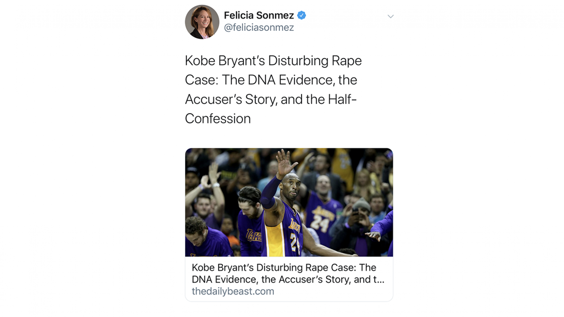 Η Felizia Sonmez δημοσίευσε ένα άρθρο της “Daily Beast”, το οποίο εξιστορούσε την υπόθεση βιασμού για την οποία κατηγορούνταν ο Κόμπι Μπράιαντ.