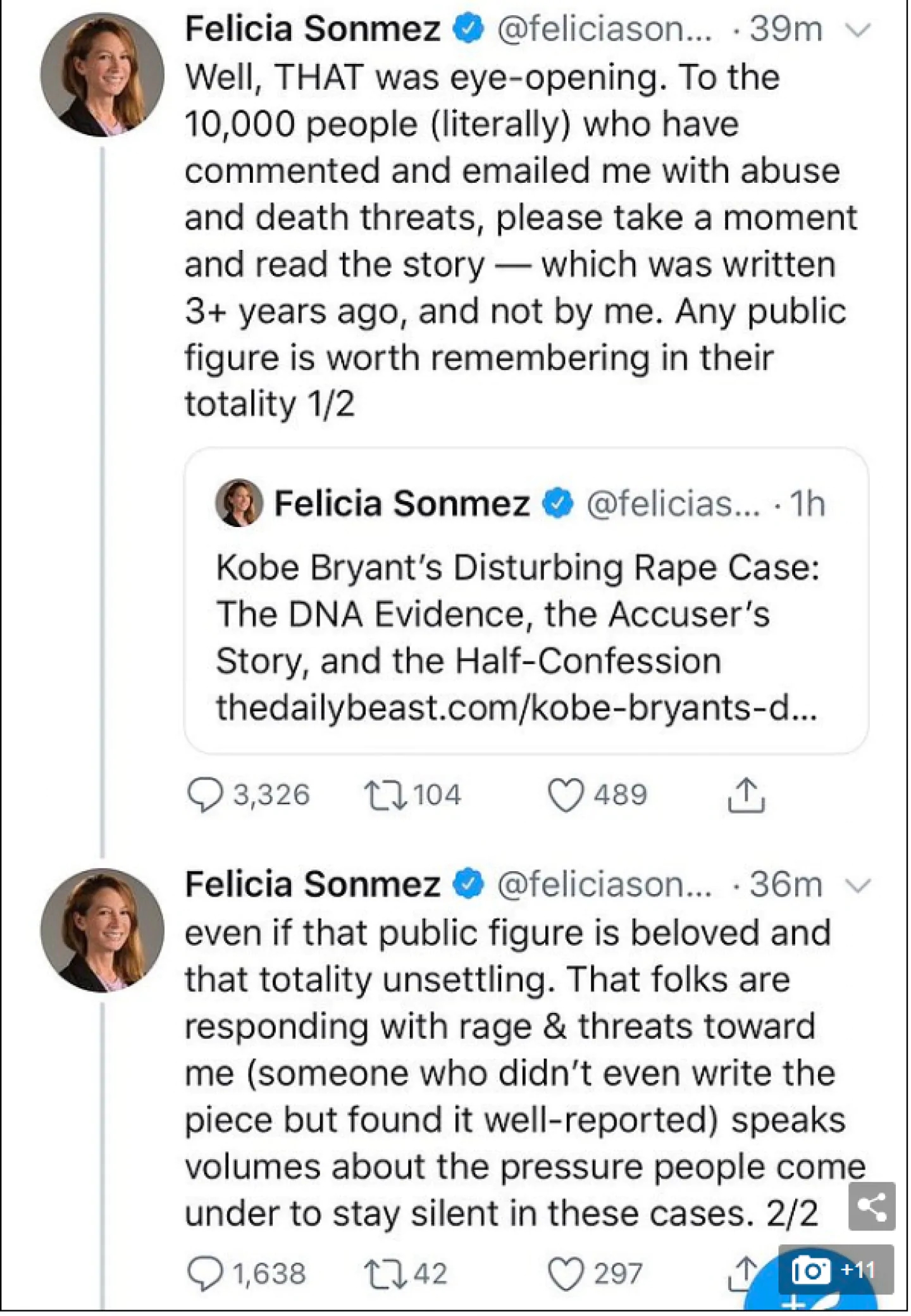 “Η Φελίσια δέχθηκε πληθώρα βίαιων μηνυμάτων, περιλαμβανομένων απειλών στις οποίες αναφερόταν η διεύθυνση του σπιτιού της, μετά από ένα tweet που ανήρτησε την Κυριακή για τον Κόμπι Μπράιαντ. Αντί να προστατεύσει και να στηρίξει έναν δημοσιογράφο η Washington Post την έθεσε σε διαθεσιμότητα.