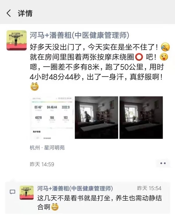 “Έχω πολλές ημέρες να βγω έξω, σήμερα δεν μπορούσε να καθίσω μέσα άλλο. Ένας γύρος είναι περίπου 8 μέτρα, έτρεξα 50 χιλιόμετρα, το έκανα μέσα σε 4:48:44, ίδρωσα και νιώθω υπέροχα”, ανέβασε στο Weibo την περασμένη εβδομάδα.