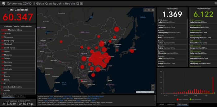 Συνολικά στην ηπειρωτική Κίνα τα επιβεβαιωμένα κρούσματα έχουν φτάσει τα 59.805 και οι θάνατοι τους 1.367.