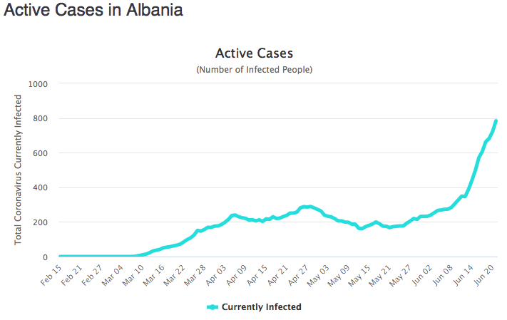 Η Αλβανία συνεχίζει να καταγράφει υψηλούς ρυθμούς κρουσμάτων κορονοϊού καθώς σύμφωνα με την τελευταία ανακοίνωση (21 Ιουνίου) στα τεστ βρέθηκαν θετικοί 71 πολίτες της. Ο αριθμός αυτός είναι ο δεύτερος μεγαλύτερος σε ημερήσια βάση στην γειτονική χώρα με τον πιο υψηλό (82 κρούσματα) να έχει καταγραφεί μόλις πέντε ημέρες πριν.