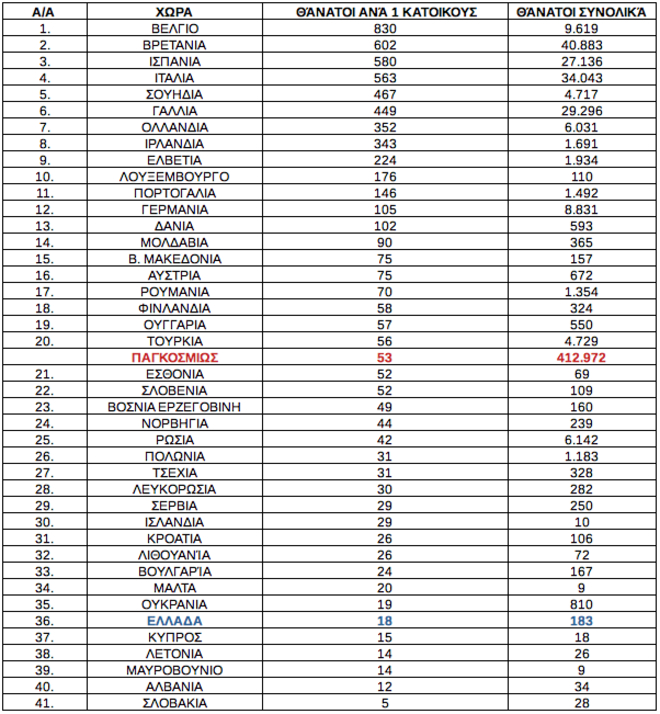 Η Ελλάδα μαζί με την Αλβανία ήταν οι δύο χώρες με την μεγαλύτερη πτώση στον πίνακα καθώς κατάφεραν να συγκρατήσουν τις απώλειες σε ανθρώπινες ζωές όταν άλλες χώρες, κυρίως της Ανατολικής Ευρώπης, εμφάνιζαν την περίοδο που εξετάζουμε (σ.σ. το δίμηνο μεταξύ 10 Απριλίου και 10 Ιουνίου) την πλέον ραγδαία άνοδο στον συγκεκριμένο τομέα.