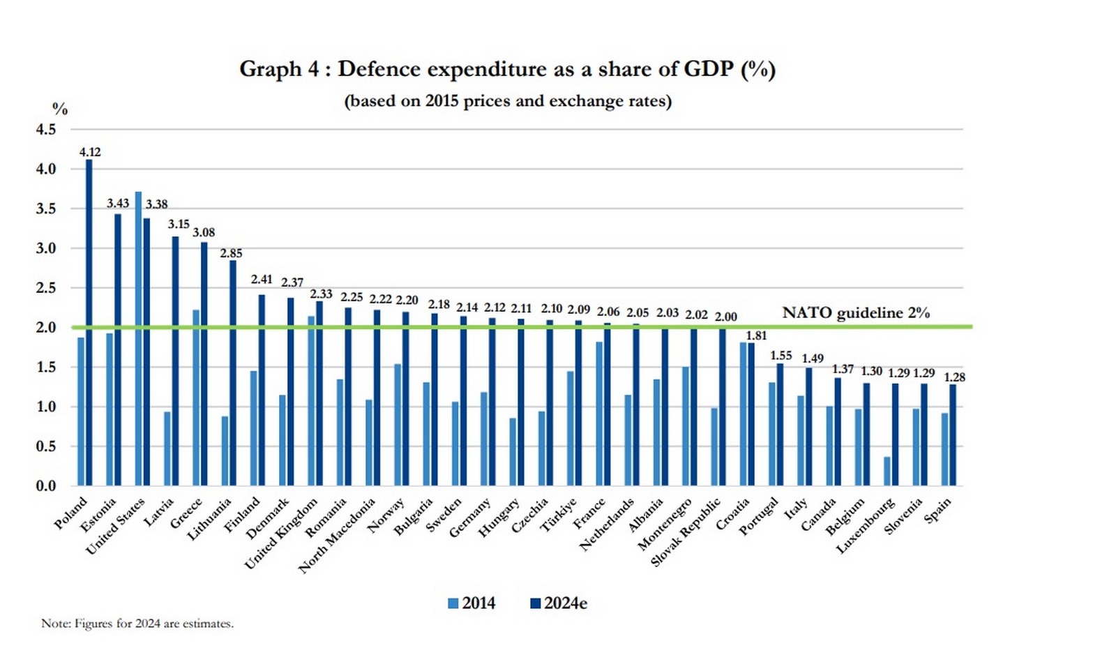 Η Αθήνα που το 2014 βρισκόταν μόλις ελάχιστα πάνω από το όριο του 2%, έχει πλέον αμυντικές δαπάνες που φτάνουν στο 3,08% του ΑΕΠ της.