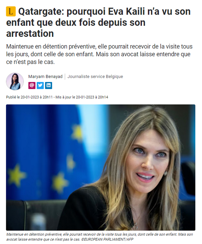 “Qatargate: Γιατί η Εύα Καϊλή έχει δει μόνο δύο φορές το παιδί της από τη σύλληψή της“ είναι ο τίτλος άρθρου της βελγικής εφημερίδας «La Libre», αναφορικά με το γεγονός ότι η πρώην αντιπρόεδρος του Ευρωκοινοβουλίου έχει δεχθεί μόνο δύο επισκέψεις από το παιδί της, αν και θα μπορούσε να δέχεται επισκέψεις καθημερινά εφόσον βρίσκεται σε προσωρινή κράτηση.