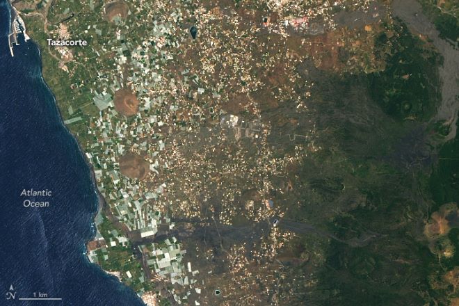 Το Operational Land Imager (OLI) του Landsat 8 κατέγραψε αυτό το ζευγάρι εικόνων φυσικού χρώματος που δείχνουν πόσο δραστικά έχουν αλλάξει οι περιοχές οι Todoque και El Paraíso. Η πρώτη εικόνα αποκτήθηκε στις 21 Μαΐου 2021. Η ακόλουθη δείχνει την ίδια περιοχή στις 15 Δεκεμβρίου 2021.