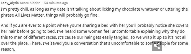 Συνεχίζοντας έγραψε: “Το ραντεβού μου κατάλαβε πως όντως δεν έχω ξαναμιλήσει με μαύρο άνθρωπο όταν έδειξα έκπληκτος επειδή μου είπε ότι έφτιαξε τα μαλλιά της μία μέρα πριν βγούμε, κάτι που προφανώς είναι κάτι κοινό σε όλους τους ανθρώπους, ωστόσο δεν το γνώριζα”.
