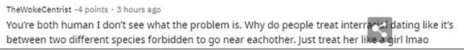 Κάτω από τη δημοσίευση υπάρχει πλήθος σχολίων. Άλλοι επαίνεσαν τον 34χρονο που έκανε το πρώτο βήμα, ενώ άλλοι έκαναν λόγο για ρατσισμό, αφού μιλάει για τη μαύρη γυναίκα σαν να είναι κάποιο… είδος προς εξαφάνιση.