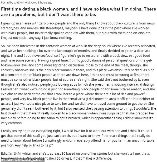 Ένας λευκός Αμερικανός άνδρας ζήτησε συμβουλές για να βγει ραντεβού με μαύρη γυναίκα, αφού παραδέχτηκε πως δεν έχει μλήσει ποτέ στη ζωή του σε άνθρωπο με μαύρο χρώμα δέρματος.