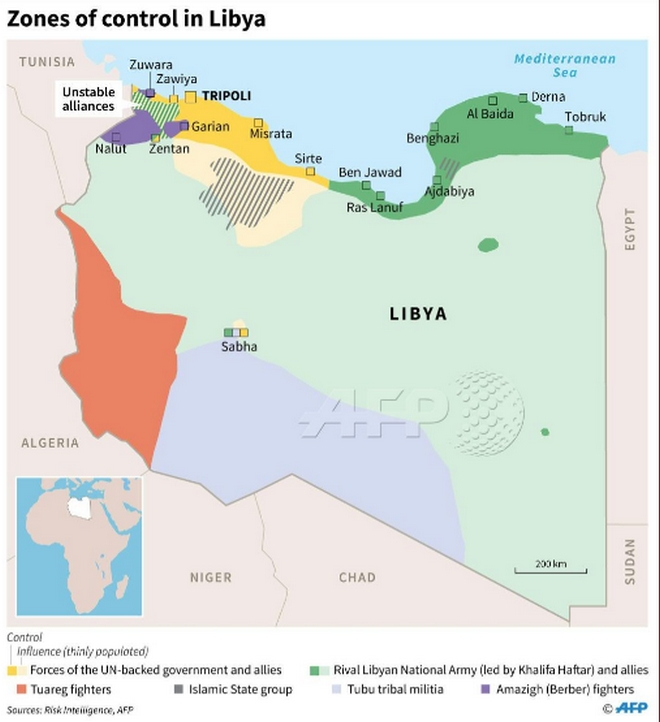 Η αναγνωρισμένη και από τον ΟΗΕ κυβέρνηση της Λιβύης ελέγχει μόλις το 10% του εδάφους της χώρας στο οποίο συμπεριλαμβάνονται οι πόλεις Μισράτα και Σύρτη αλλά και η πρωτεύουσα Τρίπολη. Η κυβέρνηση αυτή αναγνωρίζεται από την Τουρκία και από την Ιταλία.