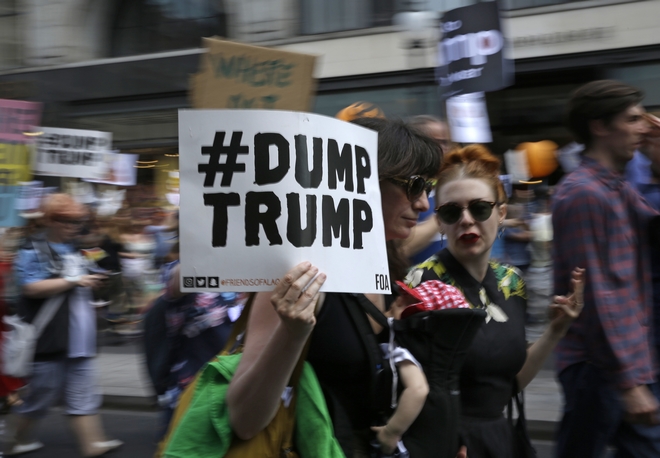 Με πανό και πλακάτ που έγραφαν “Dump Trump” (Να ξεφορτωθούμε τον Τραμπ) και “Κράτα τα μικροσκοπικά χέρια σου μακριά από τα δικαιώματα των γυναικών” οι διαδηλωτές στρέφονται κατά του αμερικανού Προέδρου, φωνάζοντας συνθήματα όπως “Ο Ντόναλντ Τραμπ πρέπει να φύγει!”.
